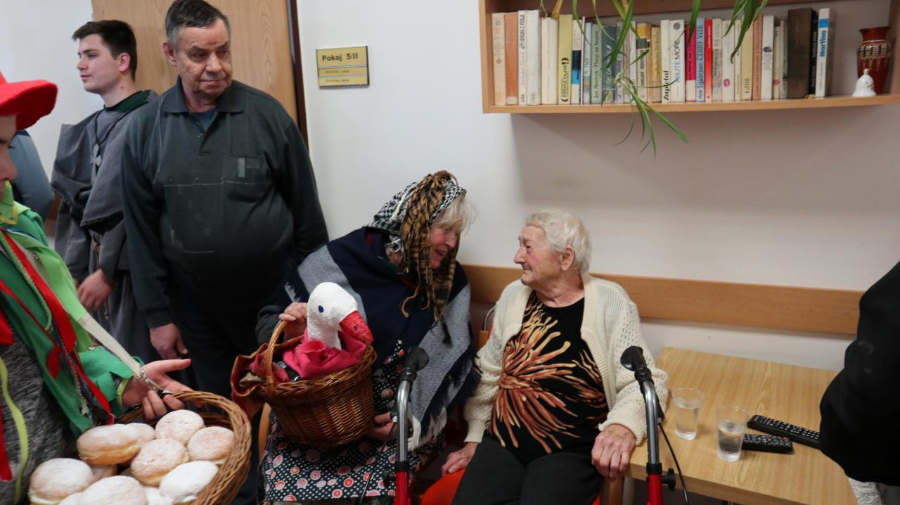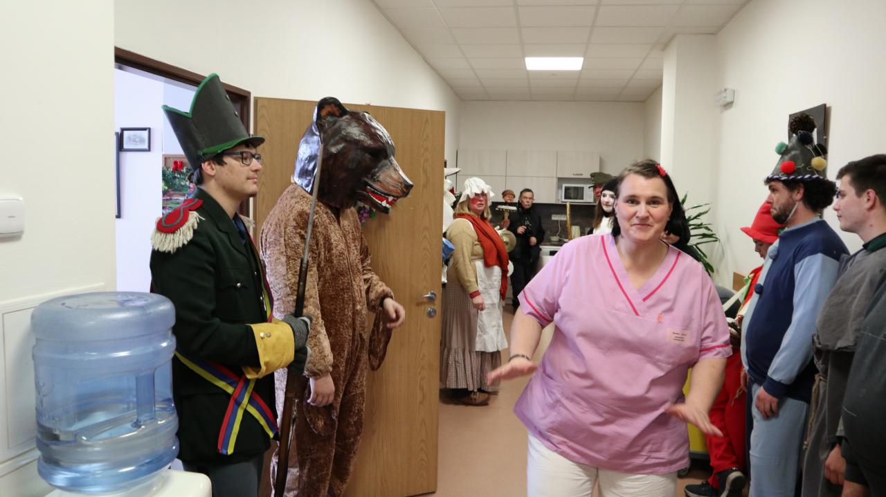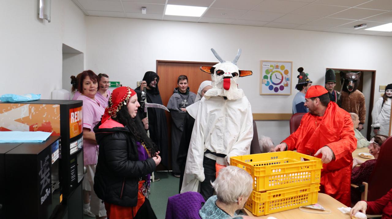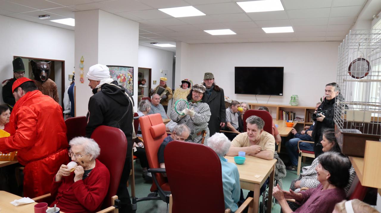 Masopustní veselí v podání maškar neprochází jen vesnicemi… Dne 22. 2. 2020 navštívil masopustní průvod i Domov pro seniory Vroutek, kde obyvatelům tohoto Domova vtrhl nejen do společenské místnosti, ale i do jejich pokojů. Udiveným, překvapeným, zároveň i potěšeným obyvatelům věštila cikánka, štěstí přál kominíček, zlobil je čert a vodník místo tance rozdával koblížky. Tato akce byla pro nás byla překvapením, nebránili jsme se pomalováním pro štěstí, radostně kvitovali řádění maškar a někteří se zapojili i do tance. Toto odpoledne jsme si společně velmi užili a dokázali jsme, že i stárnout se dá s úsměvem. Připravili jsme pro maškary ozdobené perníky a kdo chtěl tak jim přispěl do kasičky.