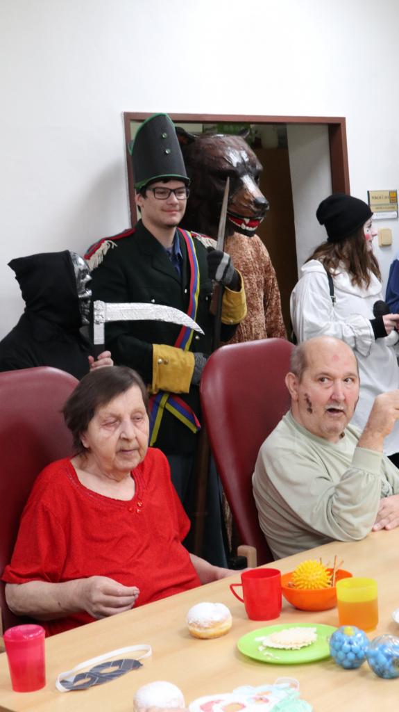 Masopustní veselí v podání maškar neprochází jen vesnicemi… Dne 22. 2. 2020 navštívil masopustní průvod i Domov pro seniory Vroutek, kde obyvatelům tohoto Domova vtrhl nejen do společenské místnosti, ale i do jejich pokojů. Udiveným, překvapeným, zároveň i potěšeným obyvatelům věštila cikánka, štěstí přál kominíček, zlobil je čert a vodník místo tance rozdával koblížky. Tato akce byla pro nás byla překvapením, nebránili jsme se pomalováním pro štěstí, radostně kvitovali řádění maškar a někteří se zapojili i do tance. Toto odpoledne jsme si společně velmi užili a dokázali jsme, že i stárnout se dá s úsměvem. Připravili jsme pro maškary ozdobené perníky a kdo chtěl tak jim přispěl do kasičky.